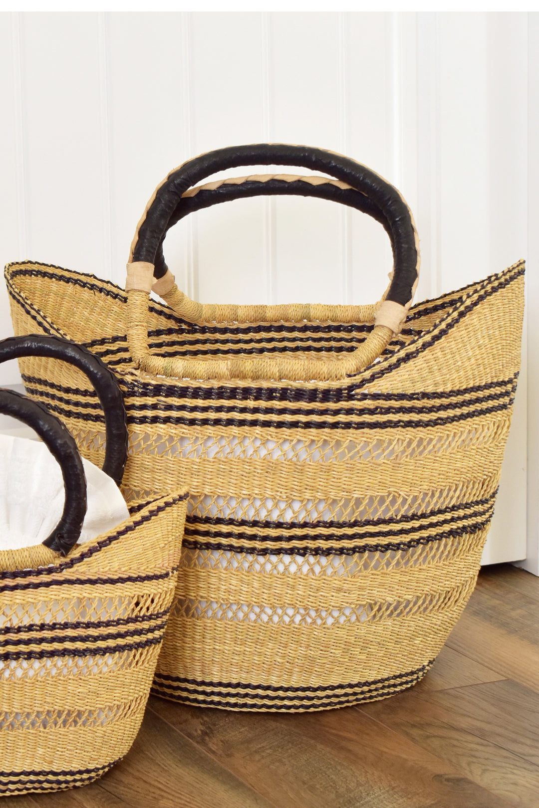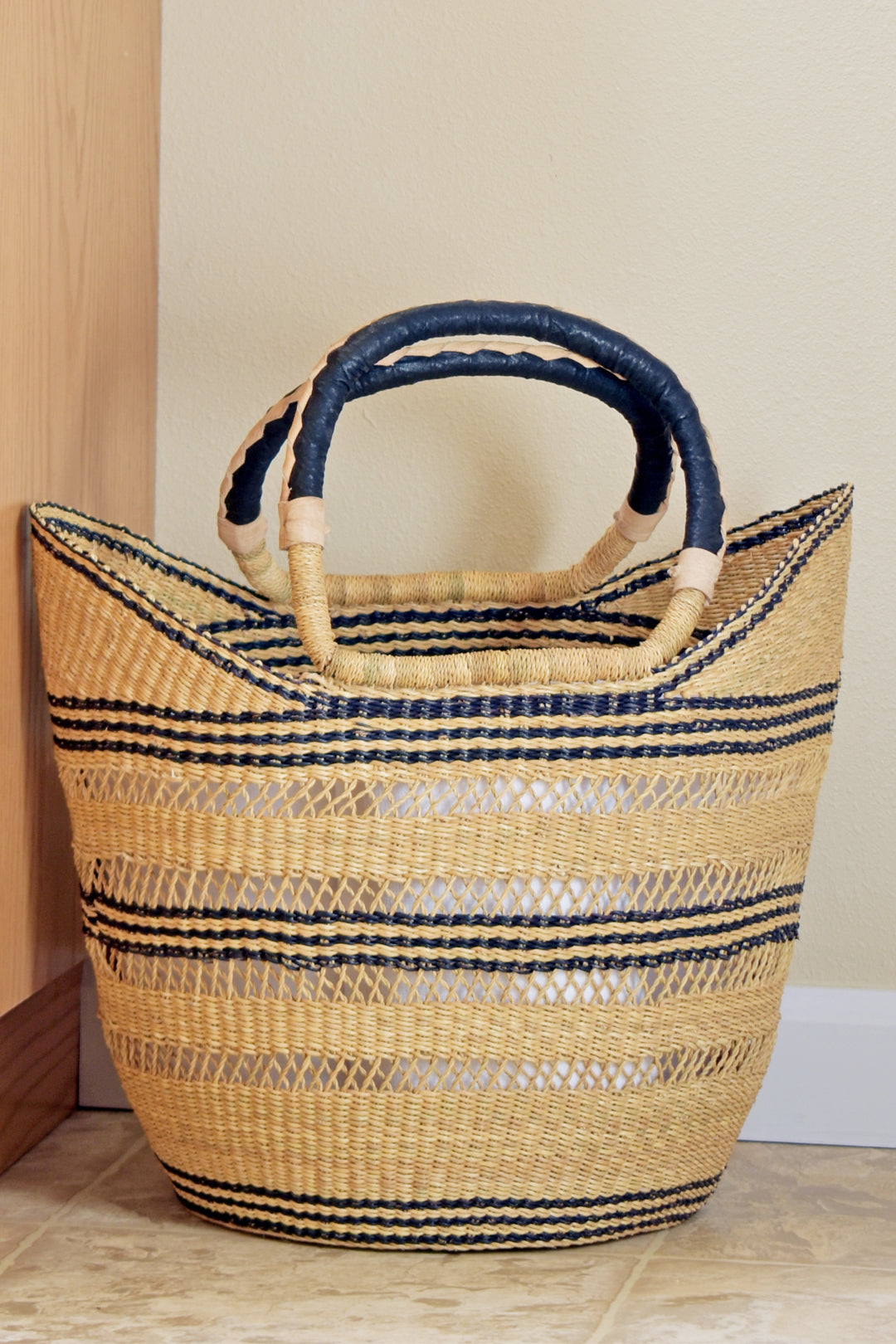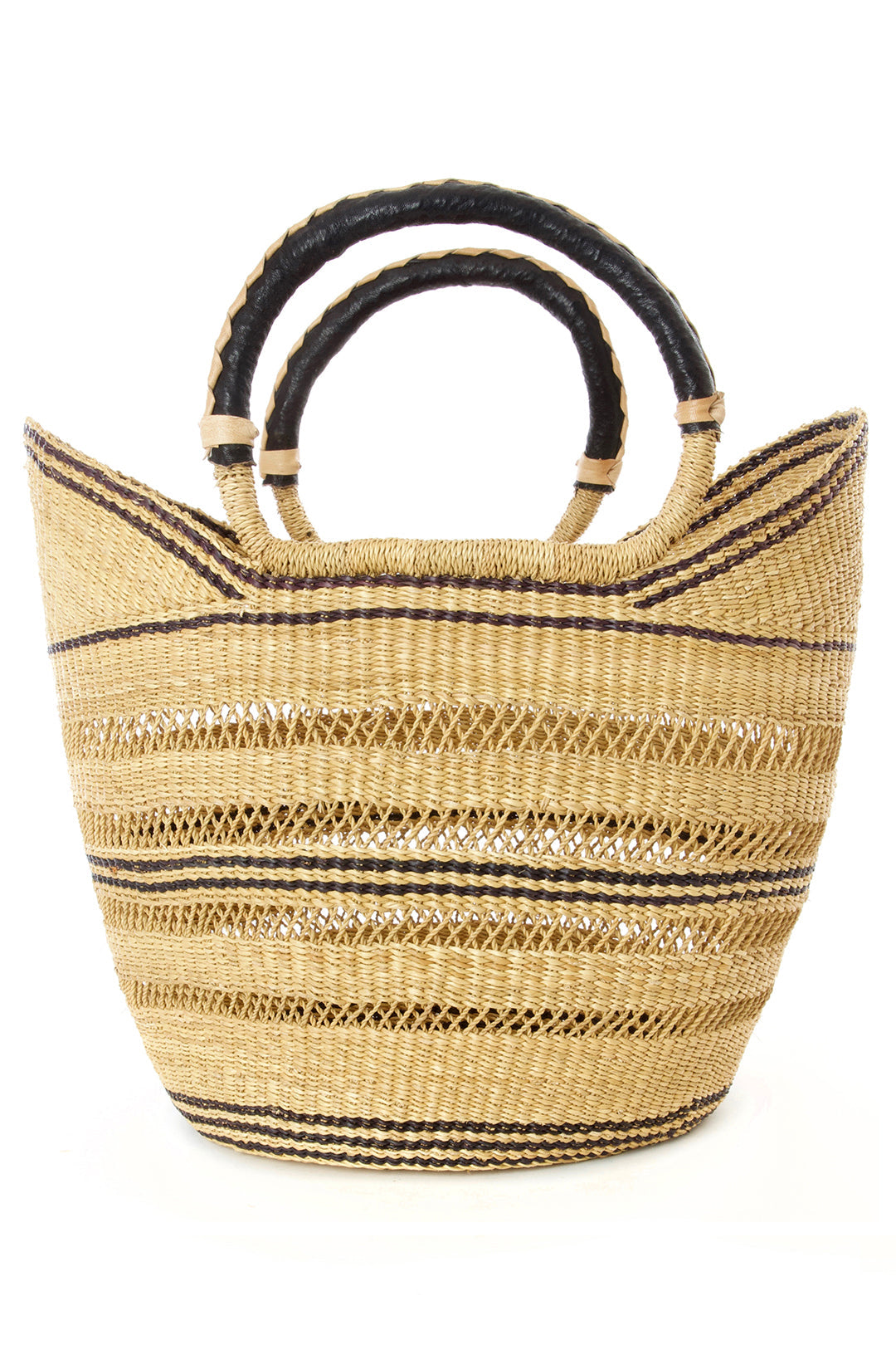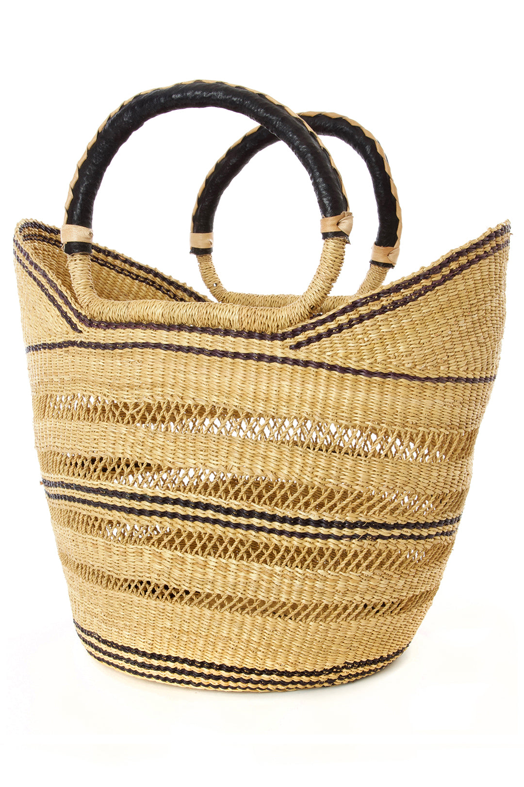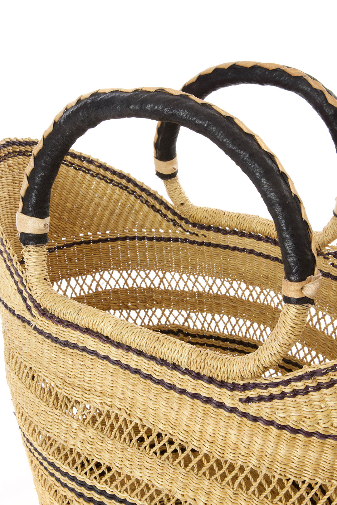 Artisans in the Bolgatanga region of Ghana weave beautiful shopper baskets from thick, tough elephant grass. An intricate lacework design adds visual interest and delicacy to this durable handmade accessory, and leather wrapped handles are comfortable to carry.