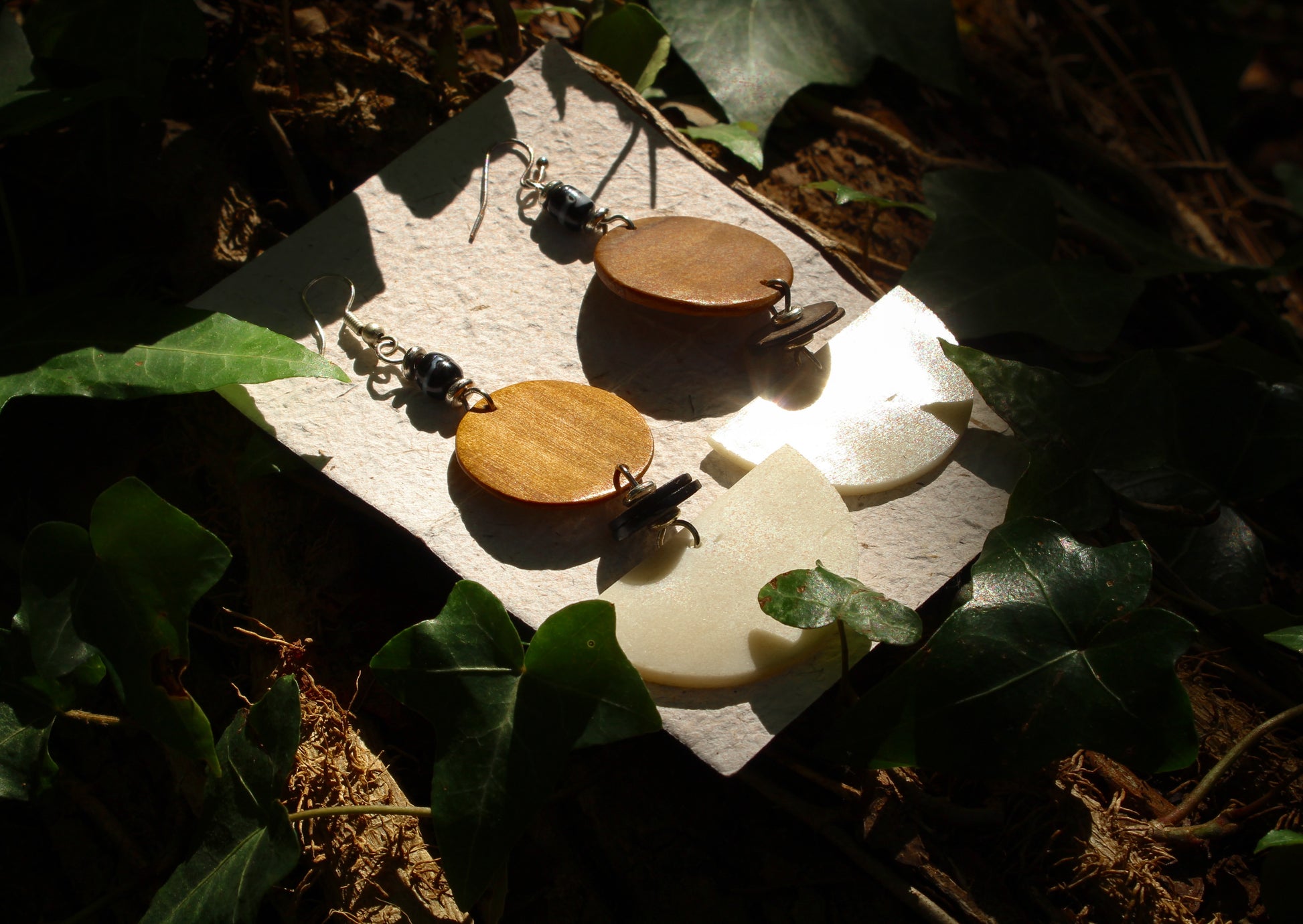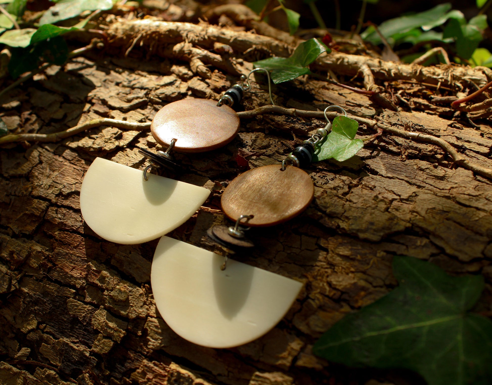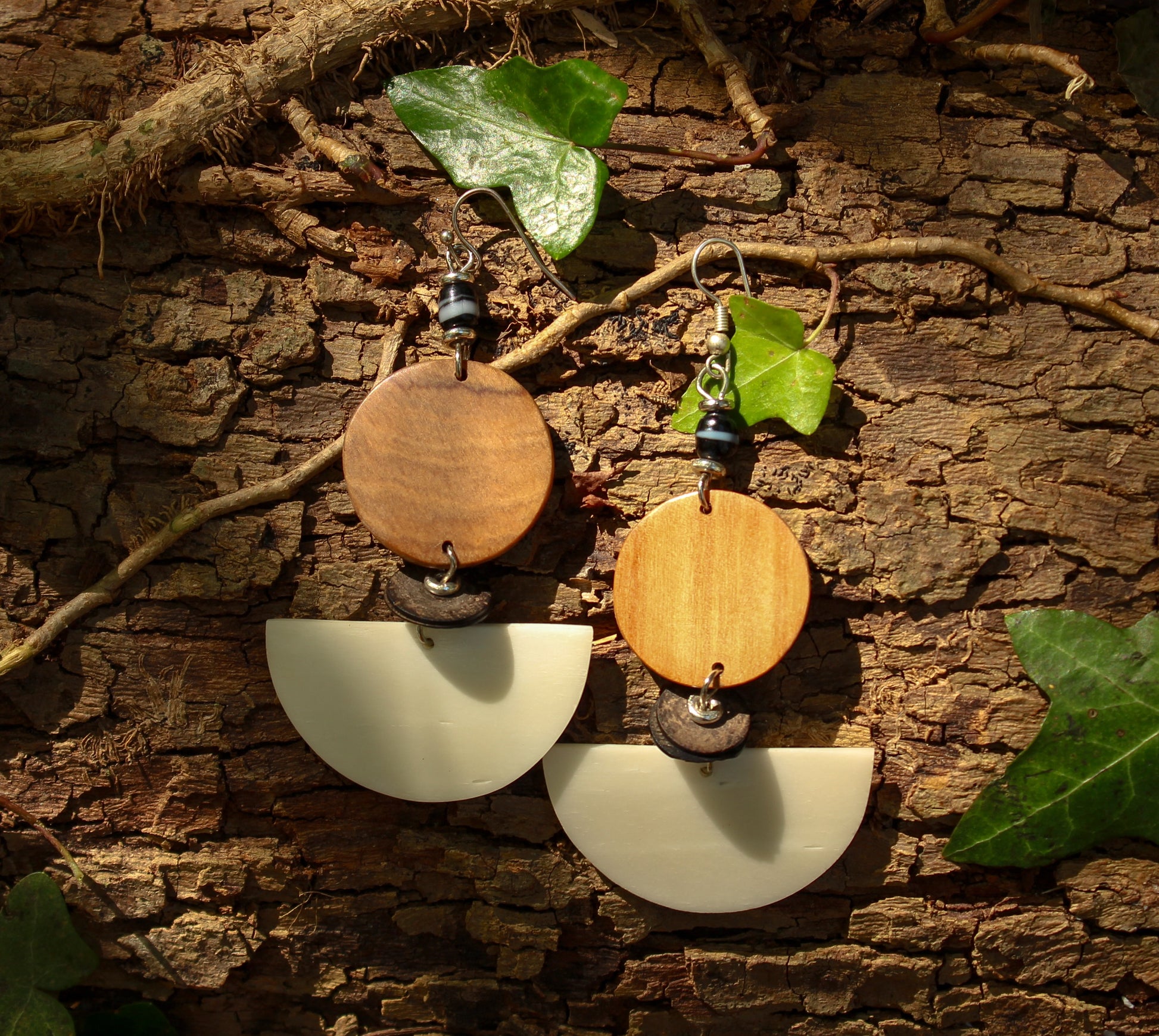 Kenyan artisans transform cow bone into eye-catching earrings with a distinctive half moon profile. A hand carved round wooden disc brings contrasting color and texture to the black and white elements of each earring.