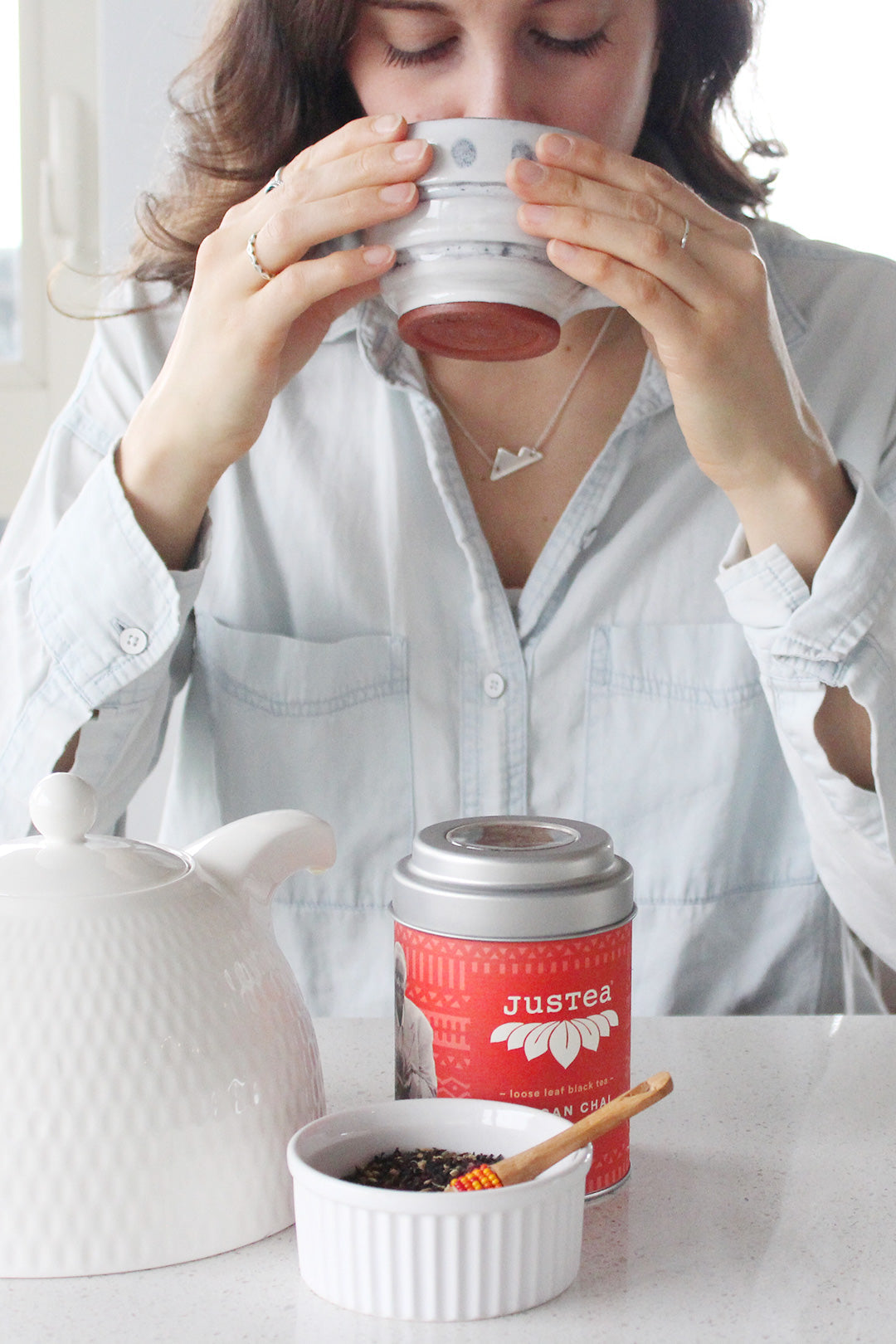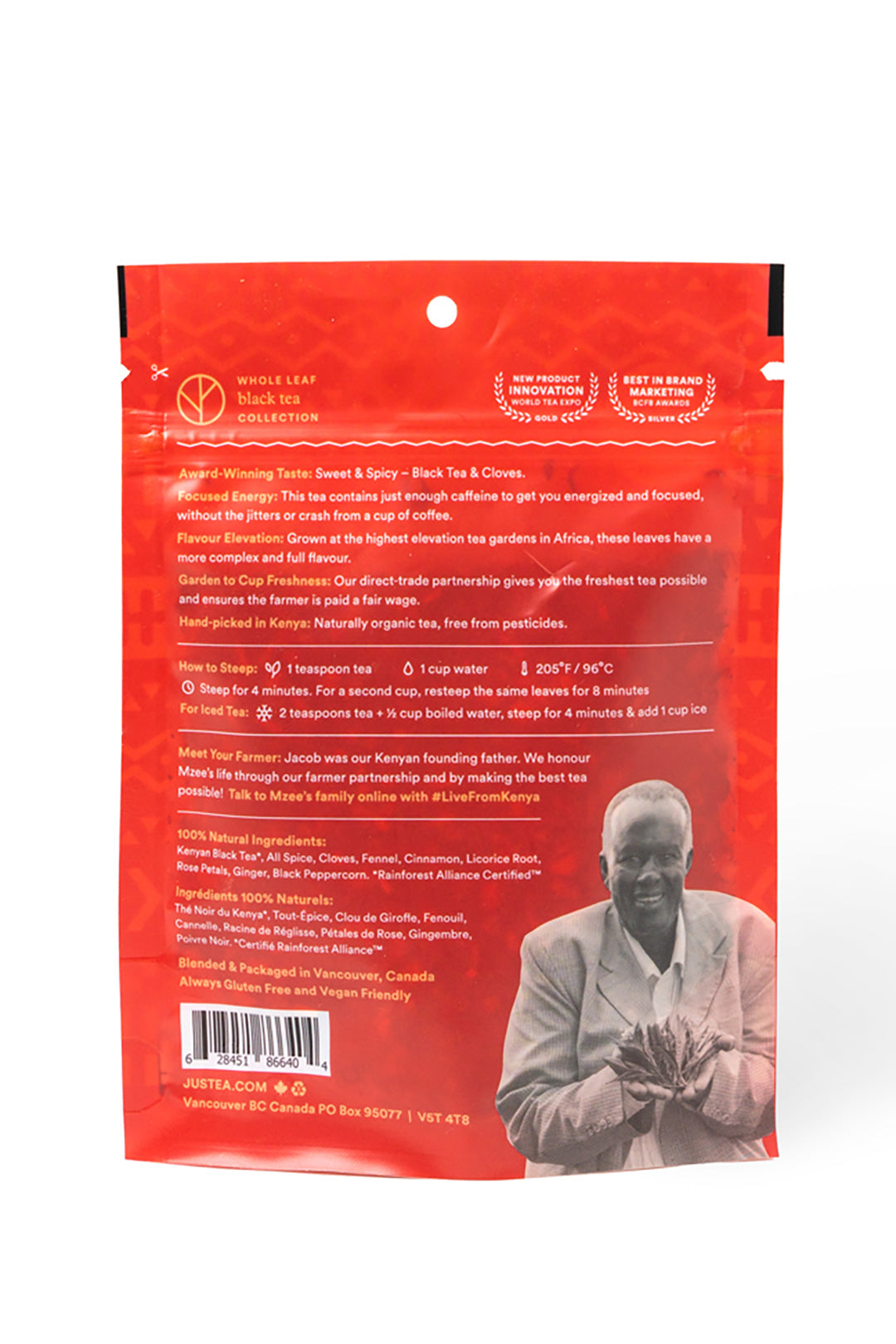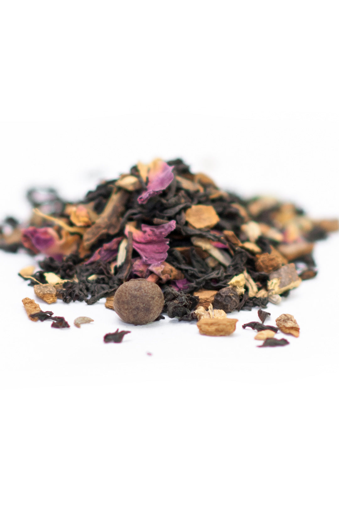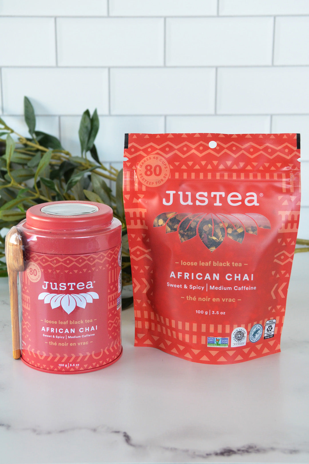 'Chai' actually just means 'tea', but here in the west, we have adopted the term to mean spiced tea. JusTea African Chai is spiced with a unique bouquet of cloves, cinnamon, fennel and rose petals. Sweet and spicy with notes of licorice root and cloves, medium-caffeine African chai is totally different from a spicy Indian Masala Chai and has been known to make chai devotees rethink how they drink their chai! Also delicious as an iced tea!
