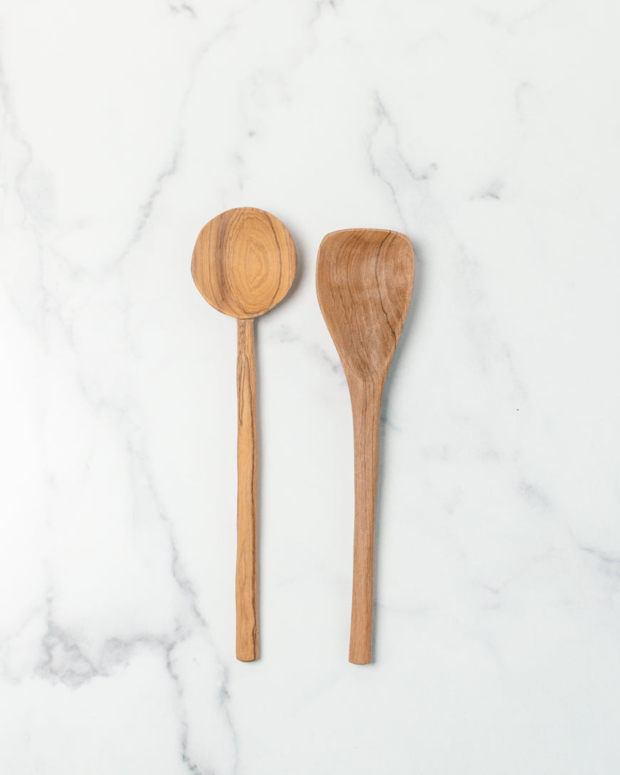 Hand-carved from natural olive wood, this cooking spoon pair is both beautiful, functional, and essential. Each is ethically crafted in Kenya under Fair Trade conditions from sustainably harvested olive wood and treated with food-safe sunflower oil.