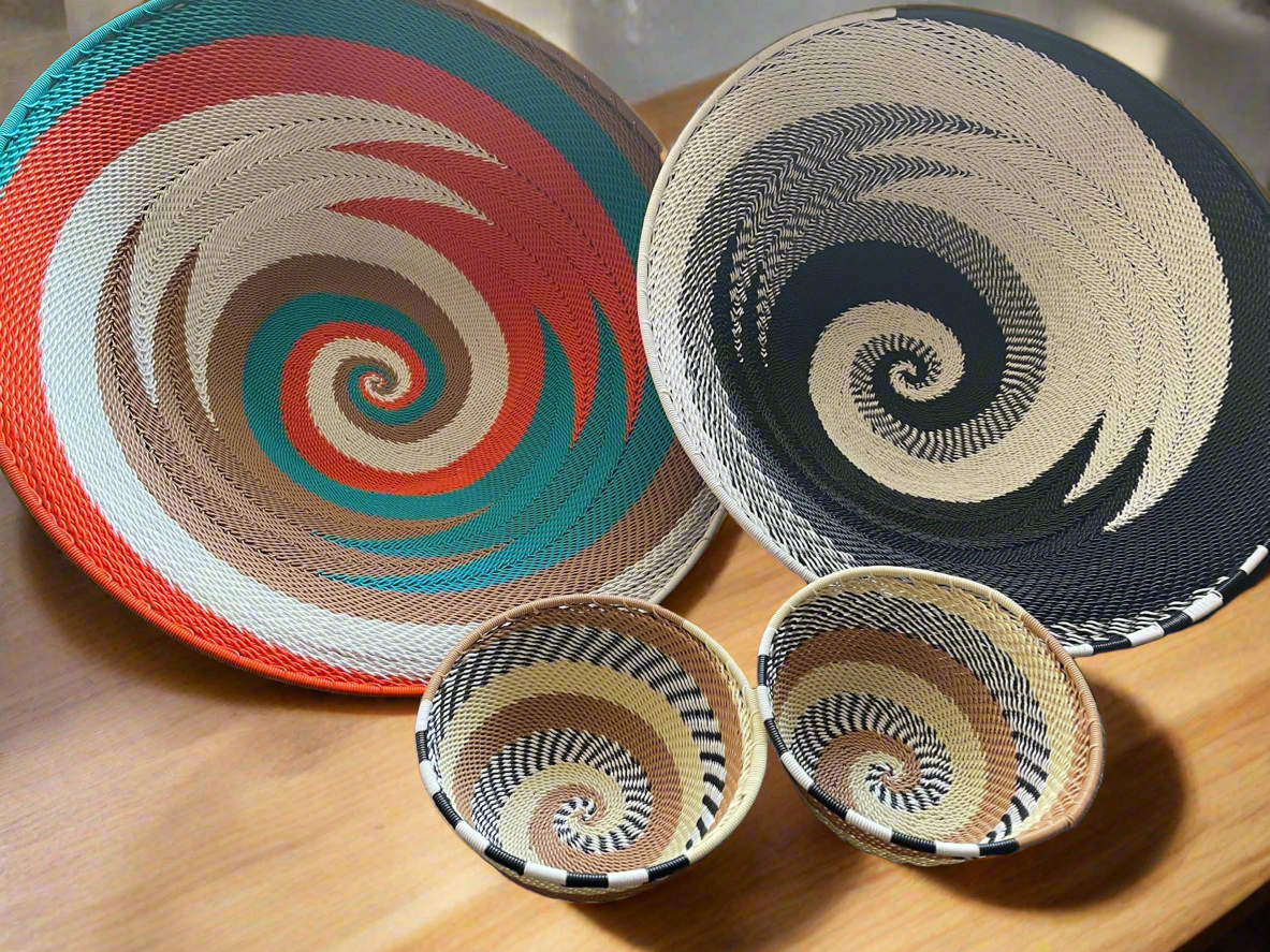 Handcrafted with recycled telephone wire by innovative South African artisans, these baskets offer an intricate and colorful spiral design that makes them as durable as they are beautiful. They will be an eye-catching addition to any home, wall decor, or tabletop display!